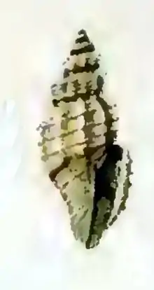 The small shell is fusiform-ovate. It has a reddish color and a darker reddish color at the sutures. The body whorl has a red band in the middle. The shell contains 6½ whorls. The 2½ protoconch whorls are convex and smooth. The third whorl is convex and is slightly obliquely lirate. The others have a broad sloping shoulder and a greatly rounded anterior portion. They show about 14 axial ribs. The spiral sculpture consists of 3 cords in the upperwhorls and 16-20 in the body whorl. The aperture is elongate-ovate, measuring about half the total length. The outer lip is marked by transverse striations and is incrassate with a strong denticle close to the posterior sinus. The microscopic structure of this species appears under the microscope to consist of numerous spiral series of very minute grain-like scales, which, at times, are arranged one under the other, so as to produce the appearance of a longitudinal series.[2]