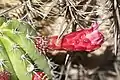 The tubular to narrow bell-shaped, light pink flowers appear near the top of the shoot and open at night. They are 4.5 to 9 centimeters long. The spherical, green or red fruits reach a diameter of 5 to 6 centimeters. The pulp is white or red.[3]