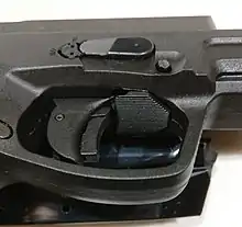 The pistol has a multi-stage safety system consisting of two automatic internal safeties, two external trigger safeties and a manual lock safety.[1] The first external trigger safety acts as the primary fail-safe. A small, spring-loaded inner trigger is housed in a wide, outer trigger and cannot be actuated unless the inset trigger is depressed first.[1] This keeps the trigger from being pulled by an inadvertent off-angle trigger pull. This trigger safety also activates and when released—deactivates the two internal safeties: the firing pin and drop safety. The firing pin safety is contained in the pistol's slide and blocks the longitudinal movement of the striker.[1] The second trigger safety is an optional, manually operated plastic bar located inside the trigger guard and projecting out from the base of the pistol's frame when activated, revealing a small white dot. This indicates that the pistol is currently incapable of being fired. It is used as an additional safety that disables the trigger with the firing pin spring cocked (after reloading the pistol). This safety is engaged by simultaneously pushing in two buttons on both sides of the frame and then deactivated by simply lifting the trigger finger and pushing the bar up and into the pistol's frame, thus allowing the trigger to be pulled back and the weapon fired.[5]