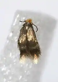The wingspan is 3.4-4.6 mm. The head in male is ochreous yellowish, in female more orange, collar light yellowish. Antennal eyecaps yellow -whitish. Forewings shining deep purplish bronze; a shining golden -silvery fascia about 3/4 apical area beyond this deep fuscous-purple. Hindwings grey.[1] Adults are on wing in May and again in August. There are two generations per year.