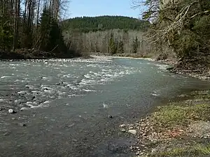 The Stillaguamish River is a river in the northwestern region of the U.S. state of Washington. It is mainly composed of two forks, the longer North Fork Stillaguamish (45 miles (72 km)) and the South Fork Stillaguamish. The two forks join near Arlington. From there the Stillaguamish River proper flows for 22 miles (35 km) to Puget Sound. The river's watershed drains part of the Cascade Range north of Seattle.
