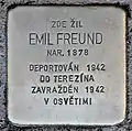 Emil Freund was born on 1 September 1878 in Ubušín. He was a trader for menswear. He married. The couple had two children, Arnošt (born 1911) and Louise (born 1916). Either 1918 or 1919 his wife died of the Spanish flu. Thereafter he married again. Until 1939 he lived in Svitavy, then he and his wife escaped to Boskovice. On 19 March 1942, he was deported from Brno to Theresienstadt concentration camp by transport Ac (his transport number was 121). According to Yad Vashem and holocaust.cz, on 27 April 1942, he was transferred to Izbica Ghetto by transport Aq (his transport number was 944).[12] However, according to an interview with his daughter Louise, he was transported to Auschwitz concentration camp, on the same train with which she had arrived in Theresienstadt. He had a pneumonia and high fever at this time. Emil Freund did not survive the Shoah.[13]
