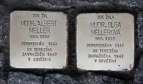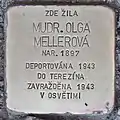 Olga Mellerová was born on 13 May 1897. She was a pediatrician and married to Albert Meller, who was also a medical doctor. Before deportation she was living in Prague in Slezská 120. On 13 July 1943, she and her husband were deported from Prague to Theresienstadt concentration camp by transport Di (her transport number was 214). From there, on 6 September 1943, she and her husband were transferred to Auschwitz by transport Dl (her transport number was 1378). There both Olga Mellerová and her husband were murdered.[19][20]