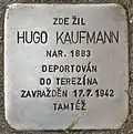 Hugo Kaufmann was born on 3 June 1883 in Ratková, Banská Bystrica Region. His parents were Adolf and Regina Kaufmann. He had at least one sister, Olga, later named Bodo. He was an industrialist and married Olga née Ehrmann. The couple had at least three sons, Bedřich (born 1911), Robert (born 1913) and Hanuš (born 1917). He was deported to Theresienstadt concentration camp at an unknown date. He was murdered there on 17 July 1942.[9][10]
