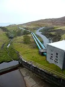 The turbine house had a slate roof and was clad in local stone, so that it would blend in with its surroundings.[11] A dam was constructed across the Bearreraig River to raise the level of Loch Leathan, which included screens to prevent debris entering the pipeline. A long wing wall was built across the surrounding hillside, to provide additional stability to the dam, because of the boggy nature of the terrain.[12] A single pipeline was initially run from the valve house by the dam to the turbine house, but the formation was made wide enough to accommodate a second pipeline, and this was added in 1956.[13]