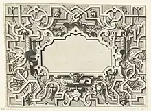 European strapwork is a frequent background and framework for grotesque ornament – arabesque or candelabra figures filled with fantastical creatures, garlands and other elements – which were a frequent decorative motif in 16th-century Northern Mannerism, and revived in the 19th century and which may appear on walls – painted, in frescos, carved in wood, or moulded in plaster or stucco – or in graphic work.[2] The Europeanized arabesque patterns called moresque are also very often combined with strapwork, especially in tooled and gilded bookbindings.