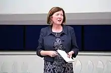 Gray has been portrayed as relatively unknown but once highly influential,[49] and has been described as "an enigma".[9] In 2015, a profile[50] by Chris Cook,[51][52] then policy editor for the BBC's Newsnight, claimed that she was "notorious… for her determination not to leave a document trail", had advised special advisers how to destroy emails through "double-deletion" and made at least six interventions "to tell departments to fight disclosures under the Freedom of Information Act".[22][53][54] She was described by former prime minister Gordon Brown, in his memoir, as someone who could be counted on for "wise advice when – as all too regularly happened – mini-crises and crises befell".[27] Rajeev Syal in The Guardian described her as "an uncompromising operator".[55] Political journalist Andrew Gimson wrote: "All power to the Civil Service is her modus operandi. She owes her allegiance to the permanent government and the deep state."[11] Former cabinet minister Oliver Letwin wrote of her: "Unless she agrees, things just don't happen. Cabinet reshuffles, departmental reorganizations, the whole lot – it's all down to Sue Gray".[56][57]