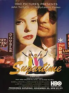 Sugartime is a 1995 American crime film directed by John N. Smith and written by Martyn Burke. It is based on the 1991 book Roemer: Man Against the Mob by William F. Roemer Jr. The film focuses on the true story of the affair between singer Phyllis McGuire of The McGuire Sisters, and Mafia boss Sam Giancana, famous for his alleged connections to John F. Kennedy and Frank Sinatra. It stars John Turturro, Mary-Louise Parker, Elias Koteas, Maury Chaykin, Louis Del Grande, Deborah Duchêne and Larissa Laskin. The film premiered on HBO on November 25, 1995.[1][2][3]