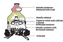The fermented molasses are then distilled in a large cylindrical metallic vessel continuously over firewood in an earthen oven. Above the main cylinder, a perforated container is placed, inside of which is a metallic collector kept on an iron tripod. The metallic collector is where the distillate sulai is collected. The bottom of the condenser vessel is plastered with mud to prevent excess ventilation during distillation.