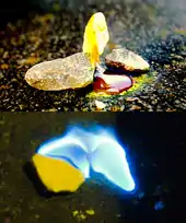 Sulfur polycations, S82+, S42+ and S162+ are produced when sulfur is reacted with oxidising agents in a strongly acidic solution.[40] The colored solutions produced by dissolving sulfur in oleum were first reported as early as 1804 by C.F. Bucholz, but the cause of the color and the structure of the polycations involved was only determined in the late 1960s. S82+ is deep blue, S42+ is yellow and S162+ is red.[12]
