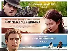 Summer in February is a 2013 British romantic drama film directed by Christopher Menaul. Novelist Jonathan Smith adapted the screenplay from his 1995 eponymous novel. The film stars Dominic Cooper, Emily Browning, Dan Stevens, Hattie Morahan and Nicholas Farrell and focuses on the true story of the love triangle between British artist Alfred Munnings, his friend Gilbert Evans and Florence Carter-Wood in early 20th-century Cornwall. It was released in the United Kingdom on 14 June 2013.[1]
