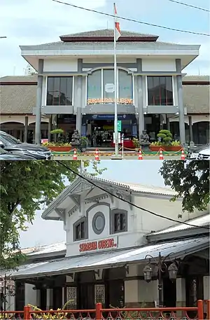 Surabaya Gubeng Station, known as Spoorwegstation Goebeng Soerabaja during the Dutch East Indies era, is a railway station located at Gubeng Station Street, Pacarkeling, Tambaksari, Surabaya, East Java, Indonesia.[3] This station is the biggest railway station in Surabaya and East Java, and is a departure from the main railway in Surabaya, especially towards the south and east, while the train that passes through the northern route, such as majors train Jakarta via Semarang, departed from Surabaya Pasar Turi Station.