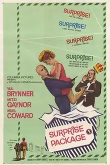 Surprise Package is a 1960 American comedy film directed by Stanley Donen and starring Yul Brynner, Mitzi Gaynor, and Noël Coward. The supporting cast features George Coulouris, Michael Balfour, Eric Pohlmann and Barry Foster.[3] The screenplay concerns an American gangster living on a Greek island who hatches a plan to steal the crown of a banished king.[4]