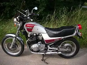 The GR650 was powered by a four-stroke air-cooled DOHC parallel twin with two valves per cylinder (four valves total). This engine had a 180° crankshaft with a gear-driven counter-balancer and a wet sump.[3] The carburetors were two Mikuni CV BS36SS. To induce swirl in the air-fuel mixture Suzuki added a sub-intake port connecting the carburetor throat to the intake port just above the valve head. Suzuki claimed that this allowed the GR650 to run with a leaner mixture than usual, which improved fuel economy.[1] Two oil jets cooled the pistons at higher engine speeds.