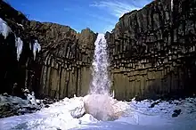 Svartifoss (Icelandic for "black waterfall", Icelandic pronunciation: [ˈsvar̥tɪˌfɔsː] ) is a waterfall in Skaftafell in Vatnajökull National Park in Iceland, and is one of the most popular sights in the park. It is surrounded by dark lava columns, which gave rise to its name.