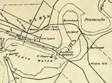 Governor Stirling's intention was that the name "Swan River" refer only to the watercourse upstream of the Heirisson Islands.[9] All of the rest, including Perth Water, he considered estuarine and which he referred to as "Melville Water". The Government notice dated 27 July 1829 stated "... the first stone will be laid of a new town to be called 'Perth', near the entrance to the estuary of the Swan River."