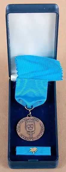 I. ^ Sometimes wrongly called Försvarsmaktens belöningsmedalj med svärd för internationella insatser[4] ("Swedish Armed Forces International Service Medal of Reward Medal with Swords") which is a different medal established in 1995.[5]