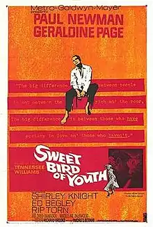 Sweet Bird of Youth is a 1962 American drama film starring Paul Newman, Geraldine Page, Shirley Knight, Madeleine Sherwood, Ed Begley, Rip Torn and Mildred Dunnock. Based on the 1959 play of the same name by Tennessee Williams, it focuses on the relationship between a drifter and a faded movie star. The film was adapted and directed by Richard Brooks.[1][2][3]