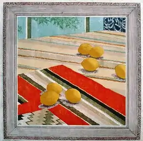 In the 1970s in St Louis, Walters's work evolved formally and thematically, including a shift from oil painting to watercolors for health reasons. She gained recognition for that work (and her drawings) alongside area painters such as Carolyn Brady Epton and Phyllis Plattner.[44][45][46] Perhaps more significantly, the qualities of that medium influenced her printmaking palette toward subtler, secondary and intermediate colors.[1] Her work also became more complex in composition and space, using pattern, texture, and devices such as printed or collaged frames within the picture plane (e.g., Seven Lemons, 1976) to create contrasts between flatness and depth, and realism and imagination.[6][47][48] In subject matter, she turned from the metaphorical to more neutrally handled imagery drawn from her immediate environment—initially domestic still lifes and scenes, and later, portraits of her husband, self, friends and colleagues—that gradually revealed minute details and motifs of a personal nature.[2][6][1]