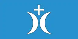 The coat of arms and flag that serve as the symbols of Warszewo, a municipal neighbourhood of the city of Szczecin, Poland, depict two white (silver) cross potent, and two white (silver) crescents with a white (silver) cross potent placed above then, on a blue background.[1][2][3]