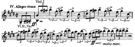 The intensity subsides, and the central melody of the third movement is restated, this time played by the first violins, while fragments of the opening theme are heard in the accompaniment. The Dies Irae motto is restated again apparently to bring about an ending to complement the first movement introduction, as the third movement concludes in a tranquil fashion dying away slowly in the strings.