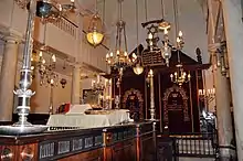 In 1804, Rabbi Solomon Abudarham died in a yellow fever epidemic.[4] The following year, in 1805, Jews represented half of Gibraltar's population.[2] In 1820, the Academy of Rabbi Solomon Abudarham on Parliament Lane was converted into a synagogue by those congregants of the Great Synagogue who were recent immigrants from Morocco and wanted a smaller, more informal setting.[4] Earlier, the building had served as the Freemason's Hall. Accordingly, Parliament Lane is still referred to as Callejon de los Masones.[3] The Abudarham Synagogue (Ladino: Esnoga Abudarham), is a small place of worship with wooden pews that face a bimah, the elevated platform on which the Torah is read.[2] The fourth and last of the active synagogues to be established in Gibraltar is located at 19 Parliament Lane.[4][15]
