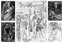 The composition of all the panels of the Passion series is based on a striking diagonal directed towards the central part of the altarpiece. The deepened space is not constructed according to optical laws; instead, the impression of depth is evoked by the diagonally inserted substance of the rock faces and sarcophagus.[19] Christ is the central figure of each composition; he also stands out from the typology of the other figures, divided as they are between the ugly, realistic faces of the soldiers and the beautiful, soft faces of the female saints and the Virgin Mary.
