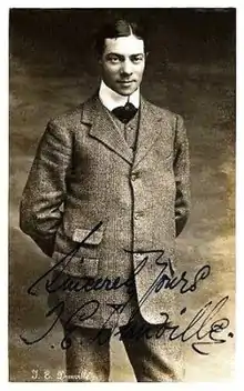 At first he worked in an acrobatic troupe, "The Merry Men", and then in pantomimes.[4] Having established himself in the northern music halls, Dunville took his act to London in 1890, performing first at the Middlesex Music Hall in Drury Lane.[5] He was billed as an "eccentric comedian and contortionist". His appearance accounted for the "eccentric" part: he had a high forehead, and wore a black wig with a wide parting on the left; he wore a loose black jacket with large buttons, tight black trousers, and large boots. A disabled arm contributed to the "contortionist" part: the arm would jerk and swing with a life of its own as he performed an eccentric dance.[6]