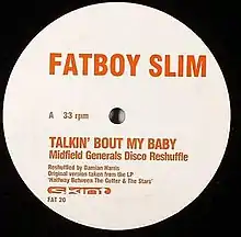 "Talkin' bout My Baby" (or "Talking 'bout My Baby") is a song by English big beat musician Fatboy Slim, released in 2002 as a single from his third studio album Halfway Between the Gutter and the Stars. The 12" single released for the song contained a remix of "Drop the Hate" as its b-side. Upon its release, it peaked at No. 92 on the UK Singles Chart. The vocal samples are taken from the Wet Willie recording "Macon Hambone Blues". The piano sample is Erik Satie's Gymnopédies.