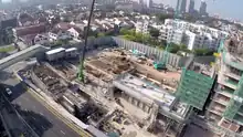 During the construction, the 10 m (33 ft) tall granite gateways for the Hwa Chong Institution (HCI) had to be dismantled and relocated temporarily.[9][10] Underpinning the gateways was initially considered, but it was figured that it will be unfeasible because of the extensive excavation for the station.[10] The arch consists of emerald-green tiles, which were first removed and mounted on temporary pillars located 40 m (130 ft) away, while the metal gates were removed.[9] The relocation was closely supervised by a safety and lifting team.[10] The gateways were later reinstated when the station was completed.[9][11]