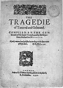 The published play is a rewritten version of Gismund of Salerne, of which two manuscript copies survive, that was written and produced by five members of the Inner Temple for Queen Elizabeth during the revels entertainments.[3] Each act was written by a different author, named respectively as Rod. Stafford, Hen. Noel, G. Al., Ch. Hatton, and Robert Wilmot. The play was revised in keeping with "the decorum of these daies" by recasting the original rhyming lines into blank verse.[4]