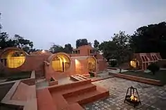 The Austrian-style brick structure was built as a hostel for artists and scientist in 1970s. Nepal started permitting foreign visitors in 1950s. The hostel was built to reflect the "Nepaliness" to the visitors. The land in which the hostel stands was acquired by His Majesty's Government in 1969. The land was transferred to the Nepal Women's Association. In 1970, Angur Baba Joshi, a prominent Nepalese scholar met Austrian architect Carl Pruscha, who served as a UN and UNESCO consultant to the Nepalese government. She then commissioned him to design the hostel. Joshi wanted to create a cultural village for artists in Nepal.[3] The construction began in 1974 and the entire complex was inaugurated on the 25 September 1974, in the presence of Queen Aishwarya Rajya Lakshmi Devi Shah. The style of the structure is a combination of Nepalese and Pruscha's European modernist architecture.[4]