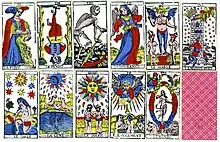 Tarot (/ˈtæroʊ/, first known as trionfi and later as tarocchi or tarocks) is a pack of playing cards, used from at least the mid-15th century in various parts of Europe to play card games such as Tarocchini. From their Italian roots, tarot-playing cards spread to most of Europe, evolving into a family of games that includes German Grosstarok and modern games such as French Tarot and Austrian Königrufen. In the late 18th century French occultists made elaborate, but unsubstantiated, claims about their history and meaning, leading to the emergence of custom decks for use in divination via tarot card reading and cartomancy.[1] Thus, there are two distinct types of tarot packs in circulation: those used for card games and those used for divination. However, some older patterns, such as the Tarot de Marseille, originally intended for playing card games, are occasionally used for cartomancy.
