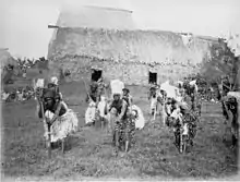 A group of traditionally dressed Matailobau warriors with charcoal blackened faces in three lines grasping their spears and leaning forward on their war clubs. Most are wearing turban like headgear. Behind them are densely thatched village buildings, and two groups of people sitting watching from a distance at Nakorovatu, Matailobau, 1881.