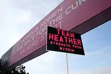 In 2003, Team Heather[6] represented Heather Gardner (Starcher) in the 2003 National Race for the Cure in her absence. By race day on June 7, 2003, with no organized fundraising efforts, Team Heather raised $5,500 for Susan G. Komen for the Cure.