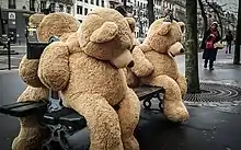 The Gobelins neighbourhood lies on the border between the 13th and 5th arrondissements,[1] around the Gobelins Manufactory and the Les Gobelins Paris Métro station. Philippe Labourel, the owner of a book shop at 25 Avenue des Gobelins,[2][3] posed a large teddy bear in his window in June 2018[4] and in mid-October began making them available on request for 48 hours and posting the resulting photos on social media.[5][6] They are 1.4 metres (4 ft 7 in) tall and weigh 4.9 kilograms (11 lb),[2][5] except for one at 2.4 metres (7 ft 10 in).[1][7] Initially offered to six neighbouring businesses,[8] they have since been sighted in all the other businesses on the avenue,[3] at bus stops, on the sign pole of the Métro station, in the windows of the mairie (town hall) of the 13th arrondissement,[9] on the Place d'Italie, 37 were photographed in the windows of the Grand Hôtel des Gobelins,[2][10] and a police station borrowed two and named them Starsky and Hutch.[1][2][11][12] On the associated Facebook page, which is run by a local pharmacist[3] and had 225,000 views as of 22 November 2018,[10][12] photos and videos by borrowers have been uploaded of the bears seeing the sights of Paris, riding around on a scooter, drinking at a bar and suffering the after-effects, and being treated for injuries at a clinic.[1] The most viewed photo is to win a bear.[6] The ad hoc group Protection des Ours des Gobelins Organisée (POGO: Organised Protection of the Gobelins Bears) reportedly guards against theft and mistreatment of the teddies.[1][13]