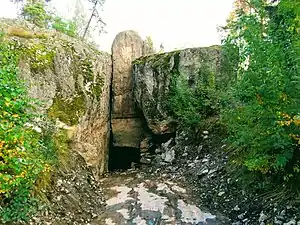 The Temple of Lemminkäinen (Finnish: Lemminkäisen temppeli) is a cave in the village of Gumbostrand,[1] located in Sipoo, Finland. It is said to contain an underground temple depicted in The Bock Saga,[2] a collection of stories by Ior Bock: according to Bock, the entrance to the temple is located under a rock that Bock calls Kyypelivuori.[3] The name of the cave refers to Lemminkäinen, a figure in Finnish mythology and one of the main characters in the Kalevala.[1] According to Bock, the entrance to the temple was closed in 987, when Christianity arrived in Uusimaa and pagan sites had to be hidden.[4]