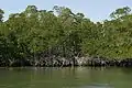 Unlike the red and black mangroves, the white mangrove usually grows on high, dryer land. The leaves of the white mangrove are different than the others because of its thick roundish leaves.[2] |