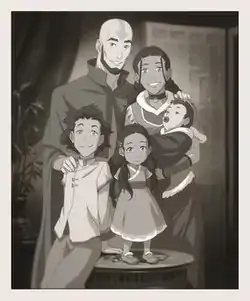 Tenzin has a longstanding friendship with Lin Beifong, who is the daughter of Toph Beifong, and at one point the two characters were romantically involved.[5] Tenzin offered her comfort and a higher level of trust was reached between the two. However, their romantic relationship deteriorated, partially because Tenzin wanted children while Lin did not and because of Lin's abrasive nature.[6] It was during this time that Pema, who was an acolyte of the Air Nation, approached Tenzin and confessed her feelings for him. This indirectly led to the end of Tenzin's romantic relationship with Lin and the beginning of his relationship with Pema. The two eventually married, and would have four children: Jinora, Ikki, Meelo and Rohan.