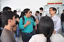 Teddy Casiño (far right with eyeglasses) listens to members of Wikimedia Philippines and OpenStreetMap Philippines during a Software Freedom Day event in 2011 at University of Santo Tomas.