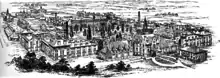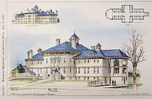 In 1866, a hospital was added to supplement the existing almshouse.[14] In that same year, Tewksbury first began accepting what were known as the "pauper insane".[5] In 1879, Tewksbury was reorganized, and its population separated according to type of illness: 40% of the beds were given over to the mentally ill; 33% to almshouse inmates, and 27% to hospital patients. By the end of the 1880s, Tewksbury had become solely a hospital, serving a combination of mentally and physically ill.[14] And by the 1890s, the original 1854 wooden almshouse building had been torn down, and the remaining almshouse buildings were repurposed for hospital use. Some of these would remain standing until the 1970s.[15]