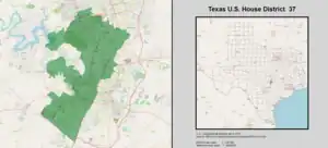 Texas's 37th congressional district of the United States House of Representatives was created as a result of the 2020 census. It consists of a portion of Travis County, including much of Austin, and extends into southern Williamson County. It is represented by Lloyd Doggett.[3] The district is contained predominantly in Travis County with a small portion of Williamson County, and consists of the majority of the city of Austin as well as small areas of its suburbs.