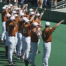 The Longhorn baseball team gives the Hook 'em Horns sign after a game.