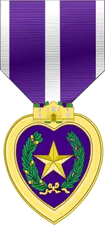 The Texas Purple Heart Medal, commonly referred to as the Texas Purple Heart, is the third highest military decoration that can be conferred to a service member of the Texas Military Forces.[1] Subsequent decorations are conferred by a white enameled five-pointed star trimmed in gold device.[2]
