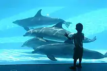 • Dolphin Bay: This 400,000 gal saltwater exhibit houses four Atlantic bottlenose dolphins: Liko, Schooner, Shadow, and Kai. The dolphins put on an educational dolphin presentation, two to three times per day (depending on the season), so visitors may speak with trainers about how they interact with their dolphins and learn more about how to conserve and protect the world's oceans.