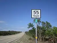 SH 55 was designated from Uvalde to La Pryor on August 21, 1923, replacing SH 3E.[2] On March 16, 1925, it was extended south to SH 2 near Cactus.[3] On October 26, 1925, it was extended north to Rocksprings.[4] On October 26, 1926, it was rerouted to Bart. On October 10, 1927, it was extended south through Catarina and then east to Artesia Wells.[5] On August 6, 1929 (effective on September 1), SH 55 was truncated to Uvalde, with everything south of there being transferred to SH 4, and the section from Catarina to Artesia Wells was cancelled in exchange for the extension of SH 4. On October 25, 1932, SH 55 extended north to its current terminus.[6] On November 30, 1932, SH 55 was extended south through Batesville and Dilley to San Diego.[7] On July 15, 1935, SH 55 was shortened to a route from Rocksprings to Uvalde.[8] On January 18, 1937, SH 55 extended to Dilley again.[9] On February 11, 1937, SH 55 extended back north to SH 30.[10] The portion from Uvalde to 4.8 miles southeast of Batesville and from Divot to Dilley were to be constructed starting on March 26, 1942, but upon completion, these sections of SH 55 were to be cancelled and changed to Farm to Market Roads. The section south of Uvalde was cancelled on January 11, 1945, and the portion from Uvalde to 4.8 miles south of Batesville was transferred to FM 117. The section from Dilley to Divot was still under construction, but changed to FM 471 on July 9, 1945.