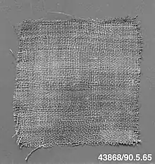 Flax is believed to be the oldest fiber that was used to create textiles, as it was found in the tombs of mummies from as early as 6500 B.C.[10][9][11] The fibers from the flax are taken from the filaments in the stem of the plant, spun together to create long strands, and then woven into long pieces of linen that were used from anything from bandages to clothing and tapestries.[11] Each fiber's length depends on the height of the leaf that it is serving, with 10 filaments in a bundle serving each leaf on the plant. Each filament is the same thickness, giving it a consistency that is ideal for spinning yarn.[9] The yarn was best used on warping boards or warping reels to create large pieces of cloth that could be dyed and woven into different patterns to create elaborate tapestries and embroideries.[10] One example of how linen was used is in the picture of a bandage that a mummy was wrapped in, dated between 305 and 30 B.C. Some of the bandages were painted with hieroglyphs if the person being buried was of importance to the community.