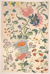 Cotton was first used in 5000 B.C. in India and the Middle East, and spread to Europe after they invaded India in 327 B.C. The manufacture and production of cotton spread rapidly in the 18th century, and it quickly became one of the most important textile fibers because of its comfort, durability, and absorbency.[9] Cotton fibers are seed hairs formed in a capsule that grows after the plant flowers. The fibers complete their growth cycle and burst to release about 30 seeds that each have between 200 and 7000 seed hairs that are between 22 and 50 millimeters long. About 90% of the seed hairs are cellulose, with the other 10% being wax, pectate, protein, and other minerals.[9] Once it is processed, cotton can be spun into yarn of various thicknesses to be woven or knitted into various different products such as velvet, chambray, corduroy, jersey, flannel, and velour that can be used in clothing tapestries, rugs, and drapes, as shown in the image of the cotton tapestry that was woven in India.[10]