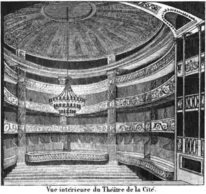 The Théâtre de la Cité-Variétés, also known simply as the Théâtre de la Cité, was an entertainment venue now demolished, located in the former rue Saint-Barthélemy, now the Boulevard du Palais, on the Île de la Cité in the modern 4th arrondissement of Paris. The theatre had a capacity of 1,800–2,000 spectators.[1]