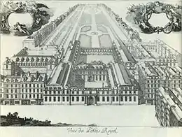 The Palais-Royal was originally known as the Palais-Cardinal, since it was built in the 1630s as the principal residence of Cardinal Richelieu.[3] The palace already had a small theatre, the Petite Salle des Comédies, located in the wing running north from the east end of the corps-de-logis. On a 1673 plan it is marked "Petite Salle des Ballets".[4] In 1637 Richelieu asked his architect Jacques Le Mercier to begin work on a larger theatre, located east of the entrance courtyard to the south. The new theatre was built between 1639 and 1640 "at the staggering cost of 300,000 livres—of which 100,000 livres was allocated to stage machinery."[5]